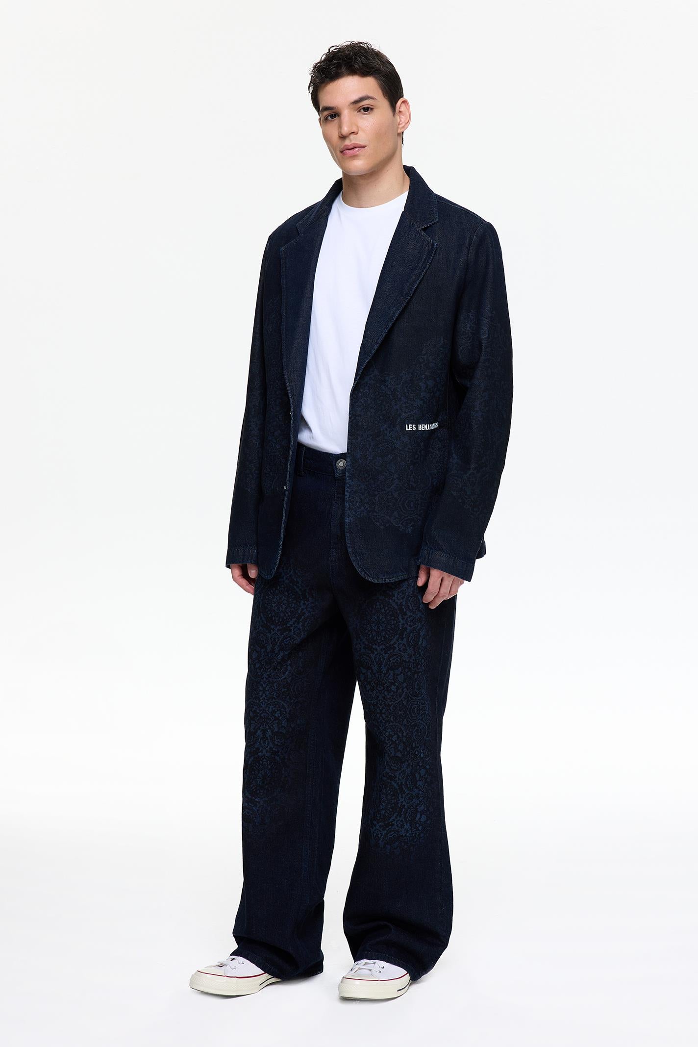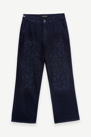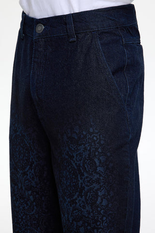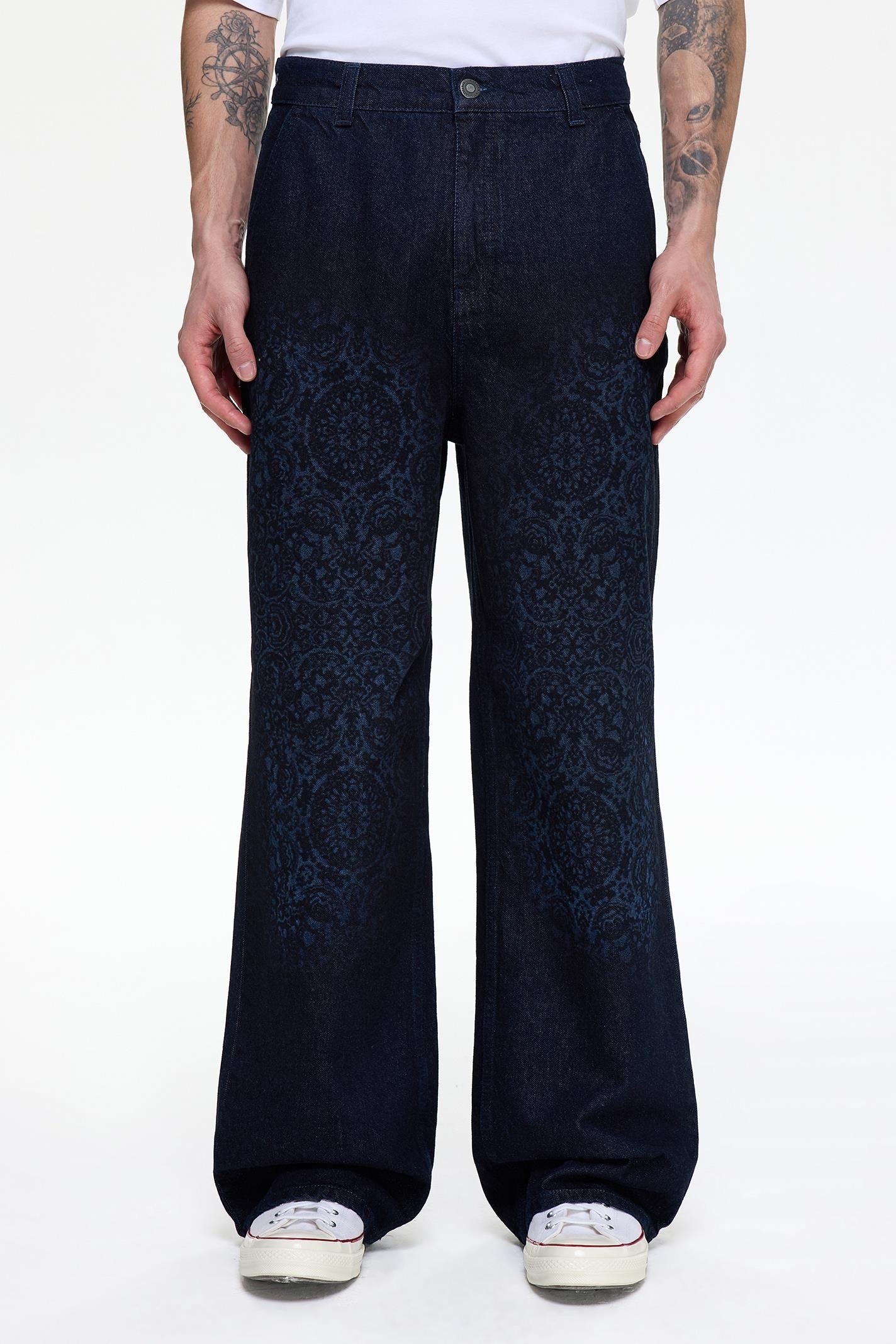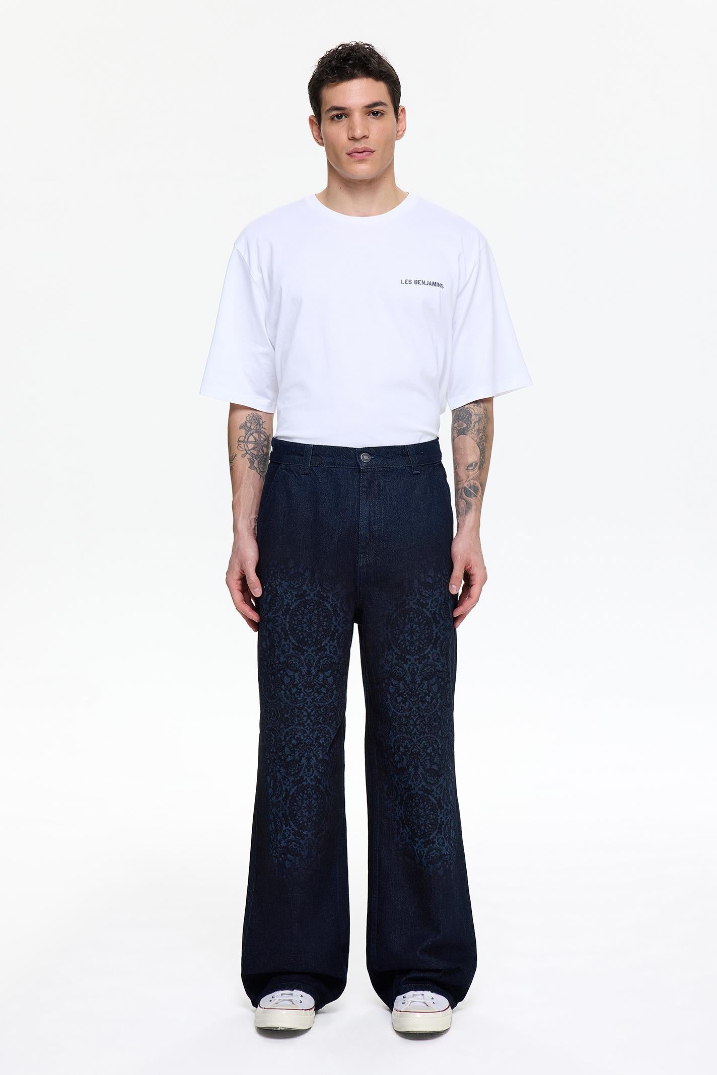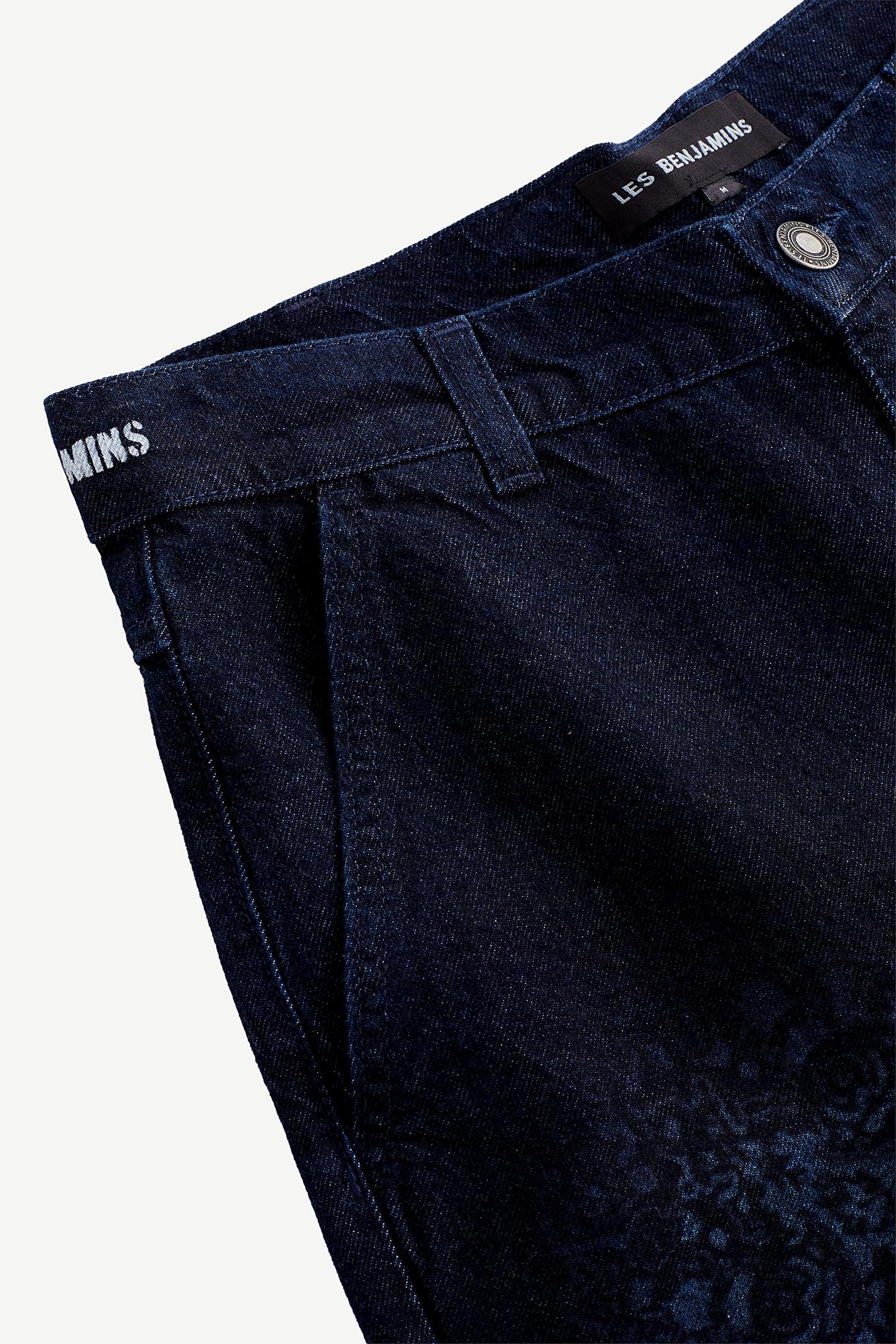 •Jeans features •Concealed pocket •Concealed pocket at the back •Water-based printing branding at the waist •Laser print carpet allover