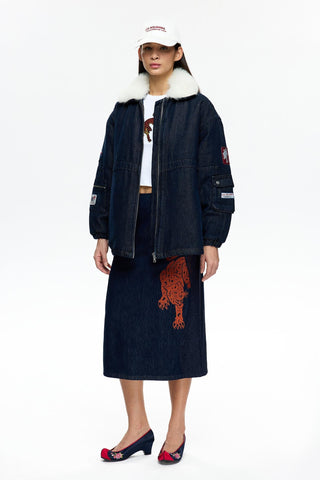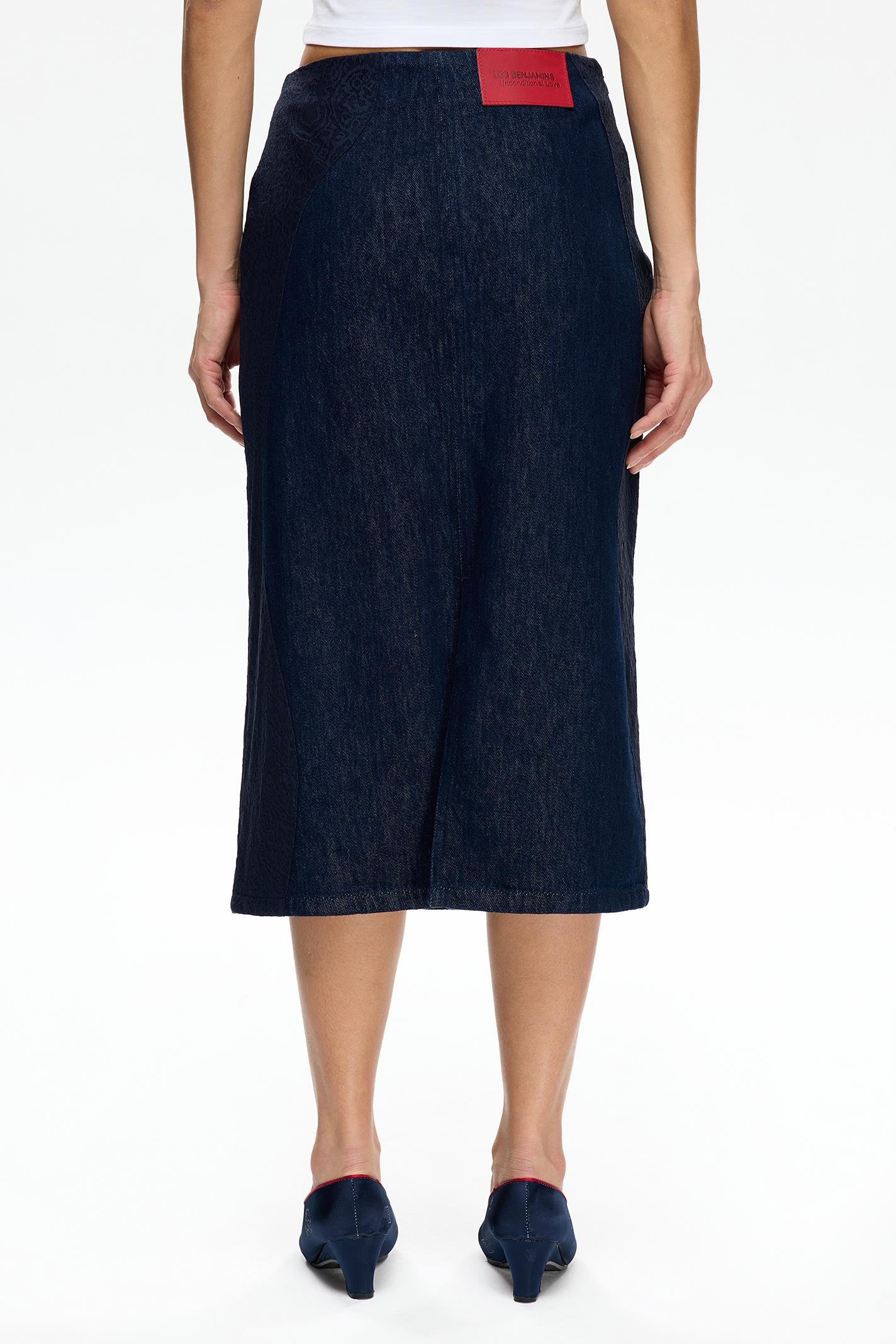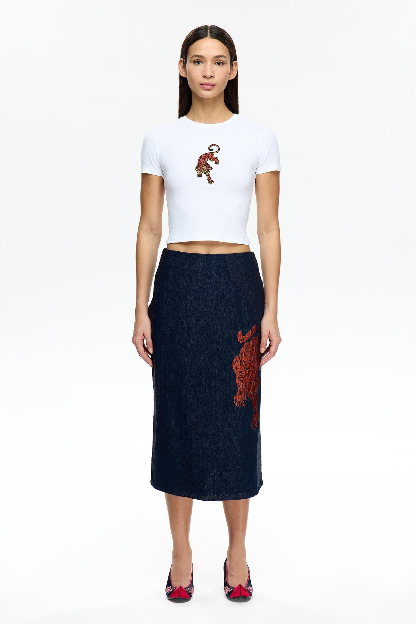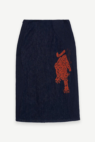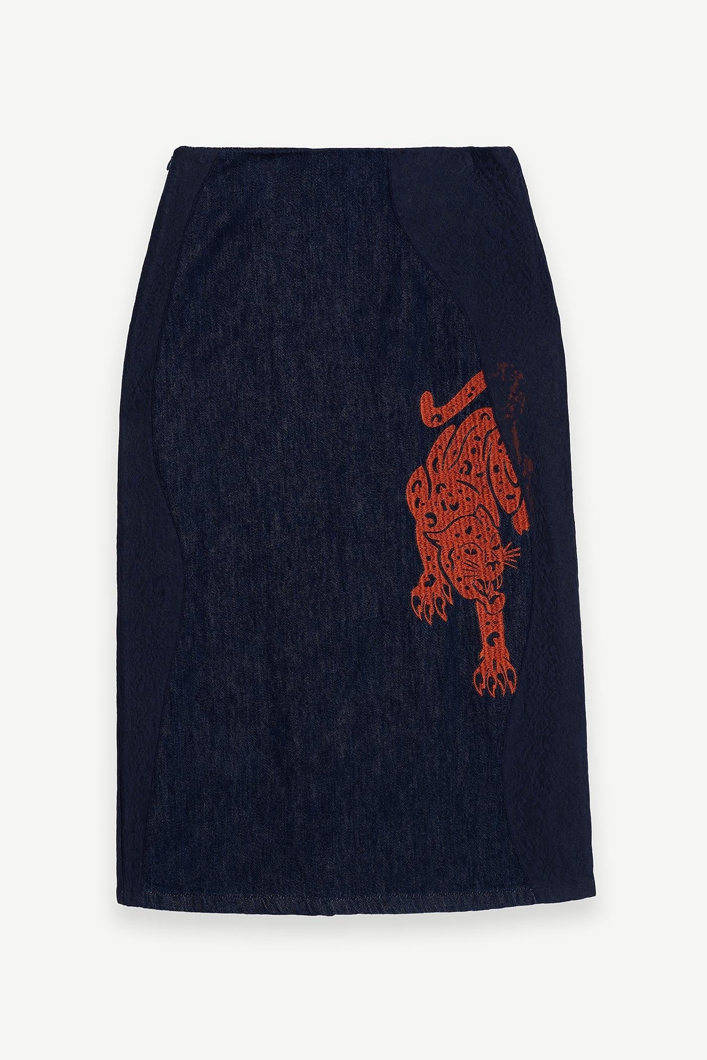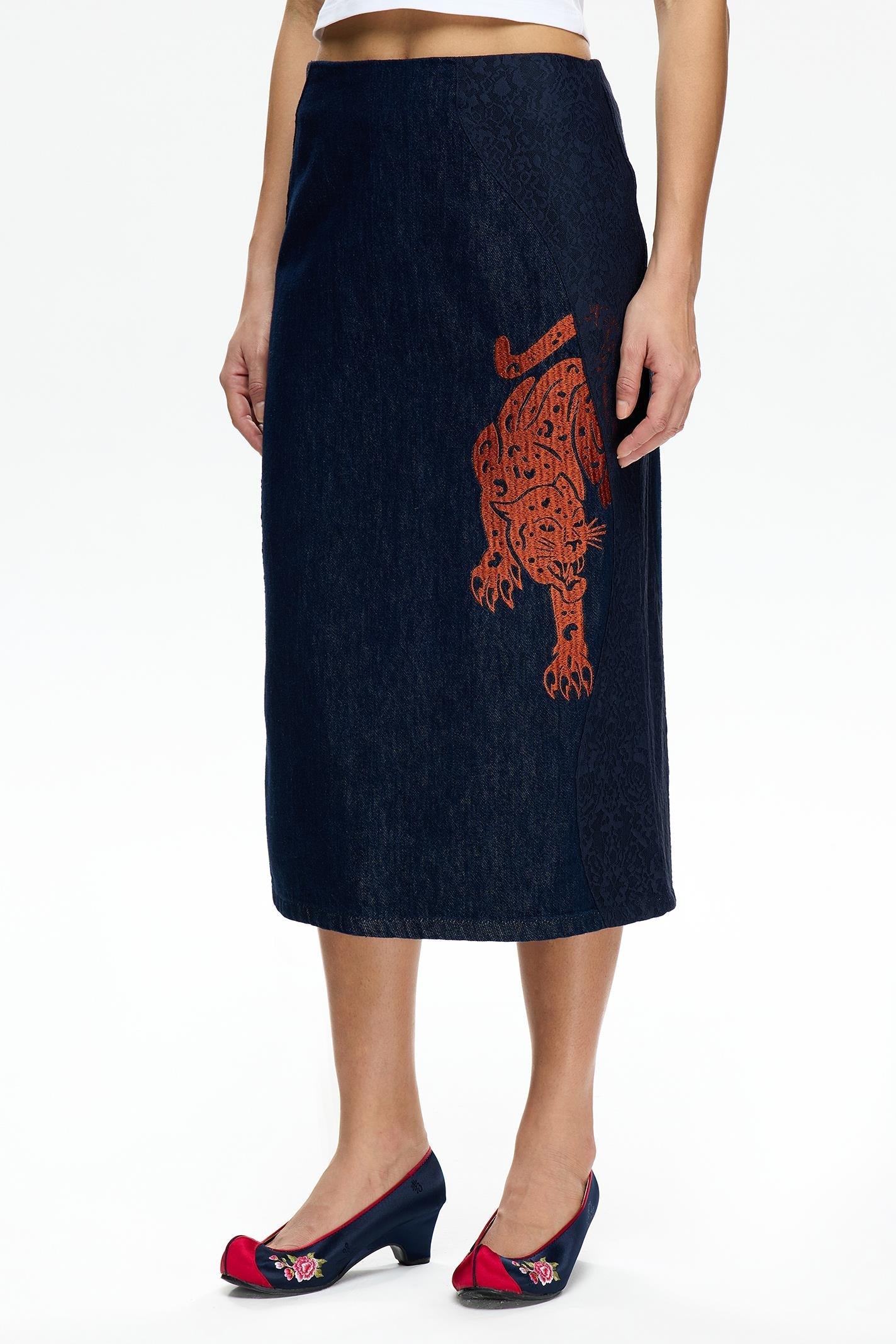 • Long skirt • Closed back slit • Hidden zipper • Seasonal wrap embroidery at the front • Leather jacron branding at the waist