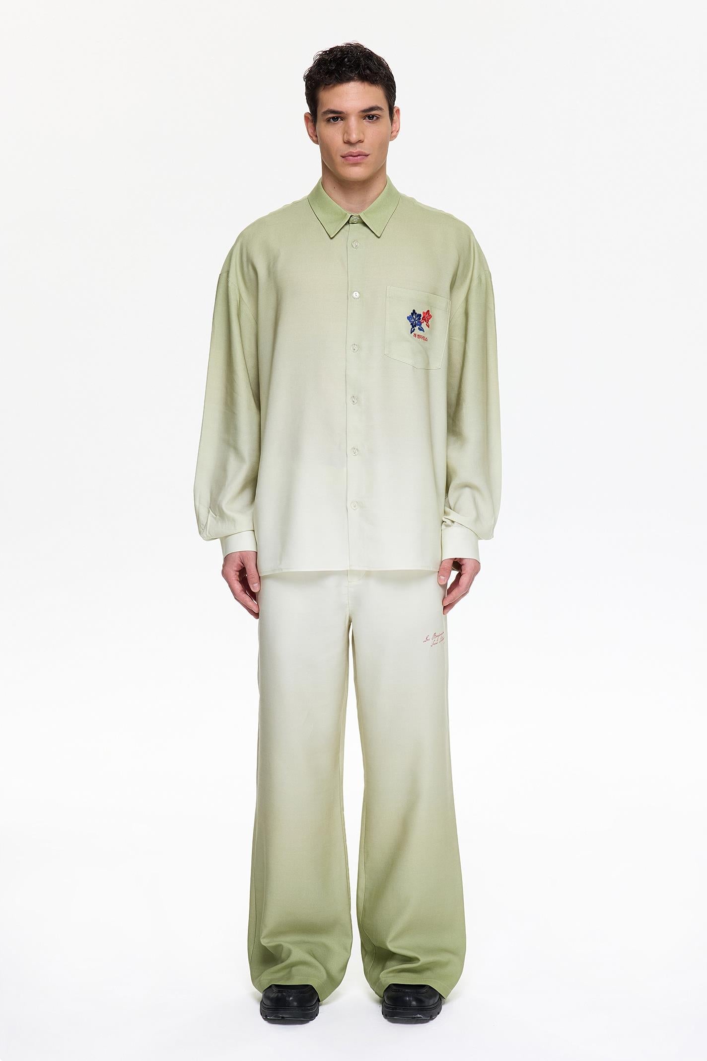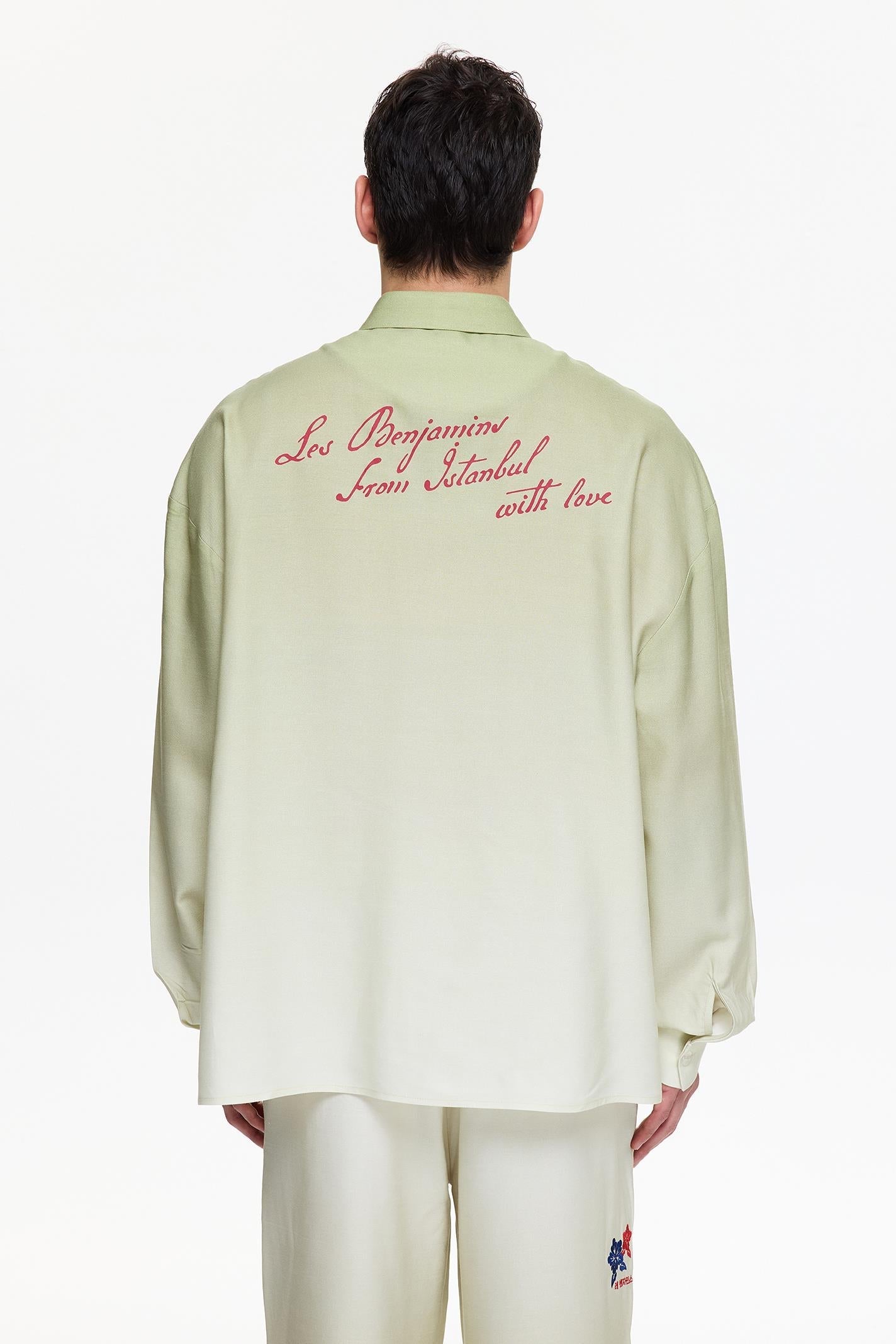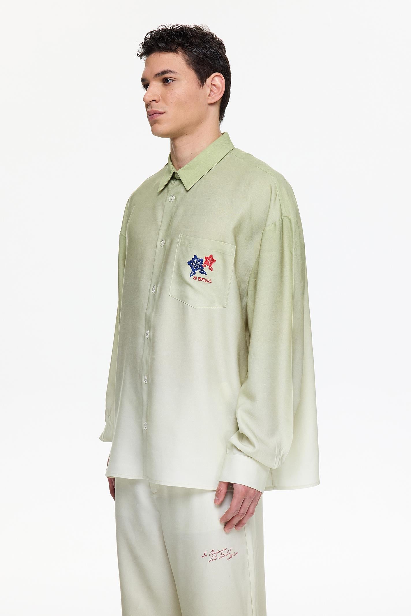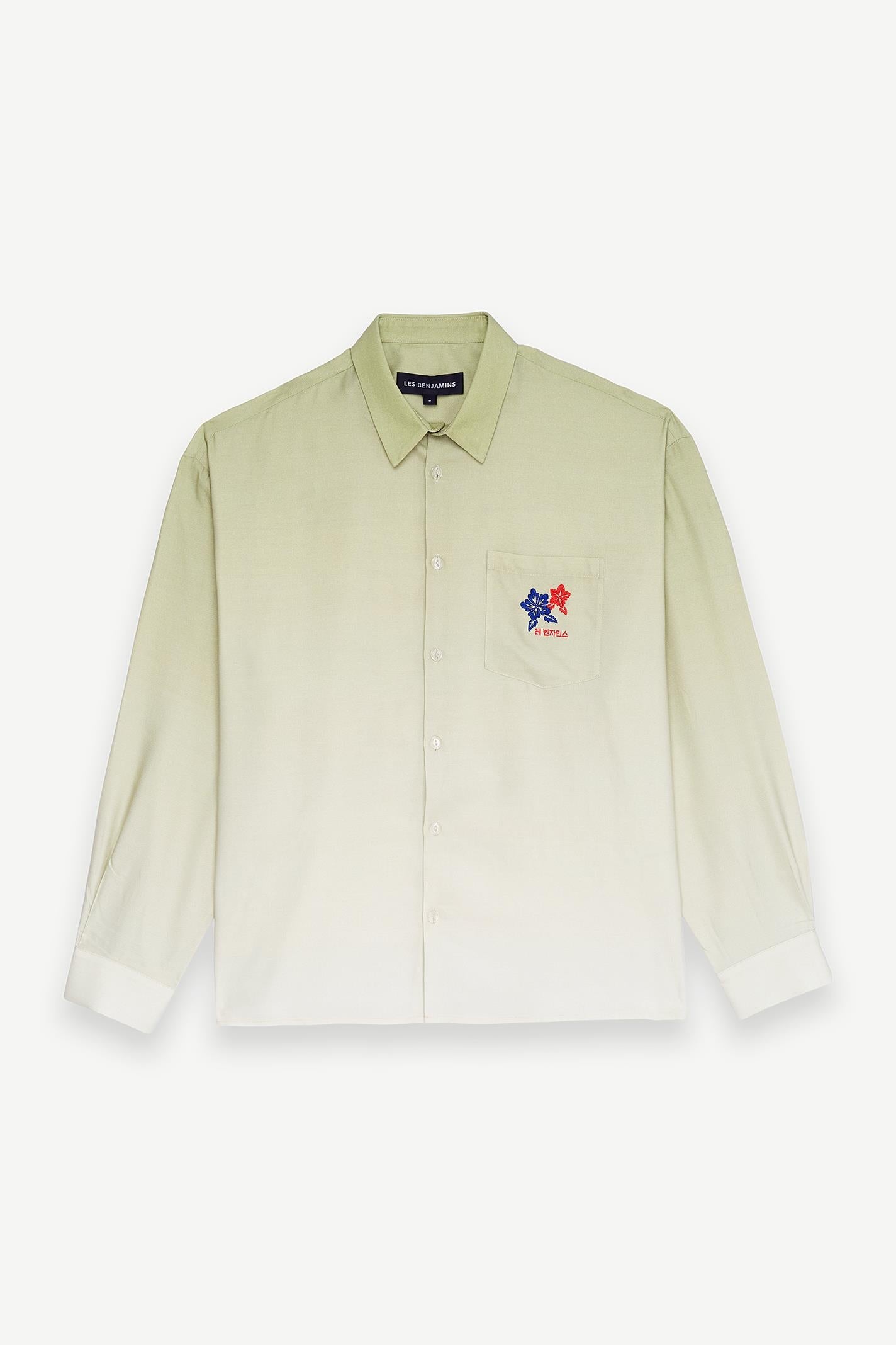 •Button closure •Gradient digital printing •Chest pocket •Seasonal wrap embroidery branding on chest •Water-based printing branding on the back