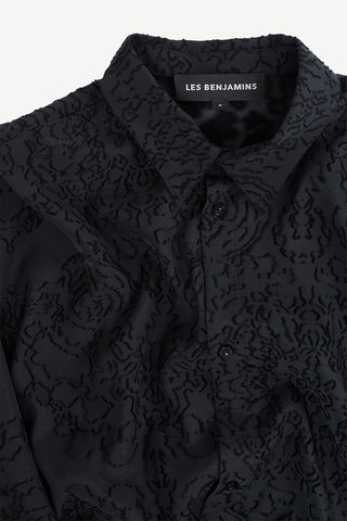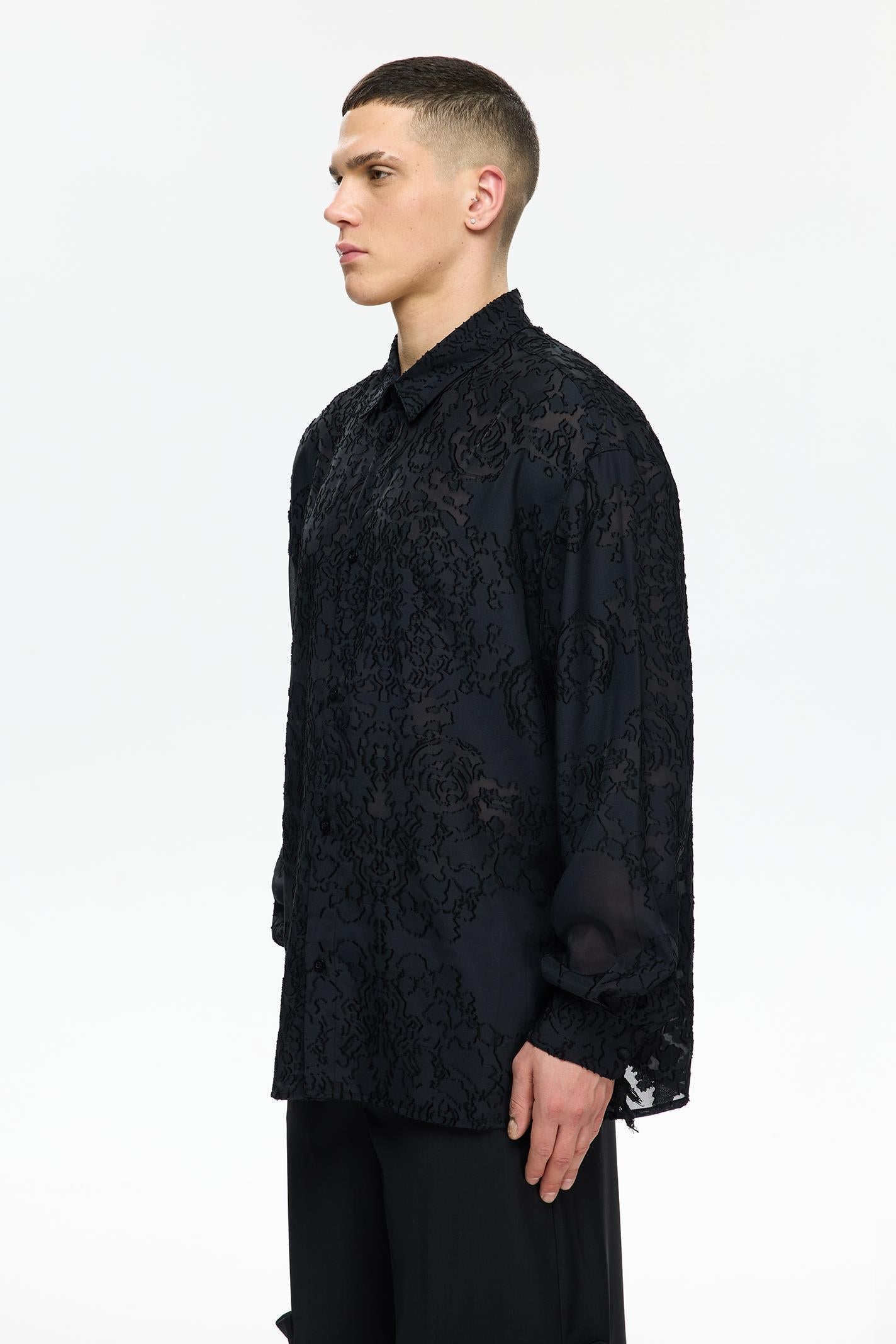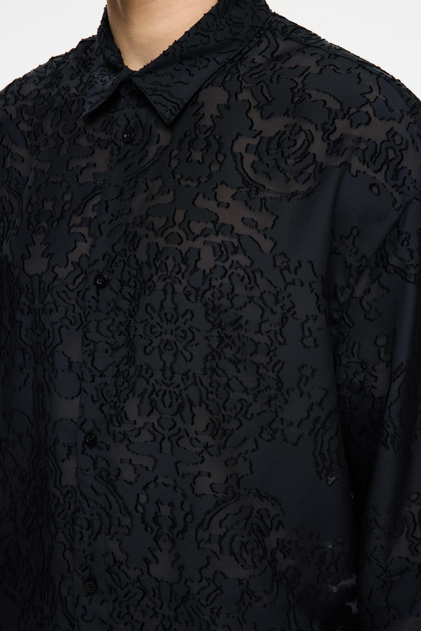 •Long sleeves •Button closure •Devore print •Reusable lace around the sleeve