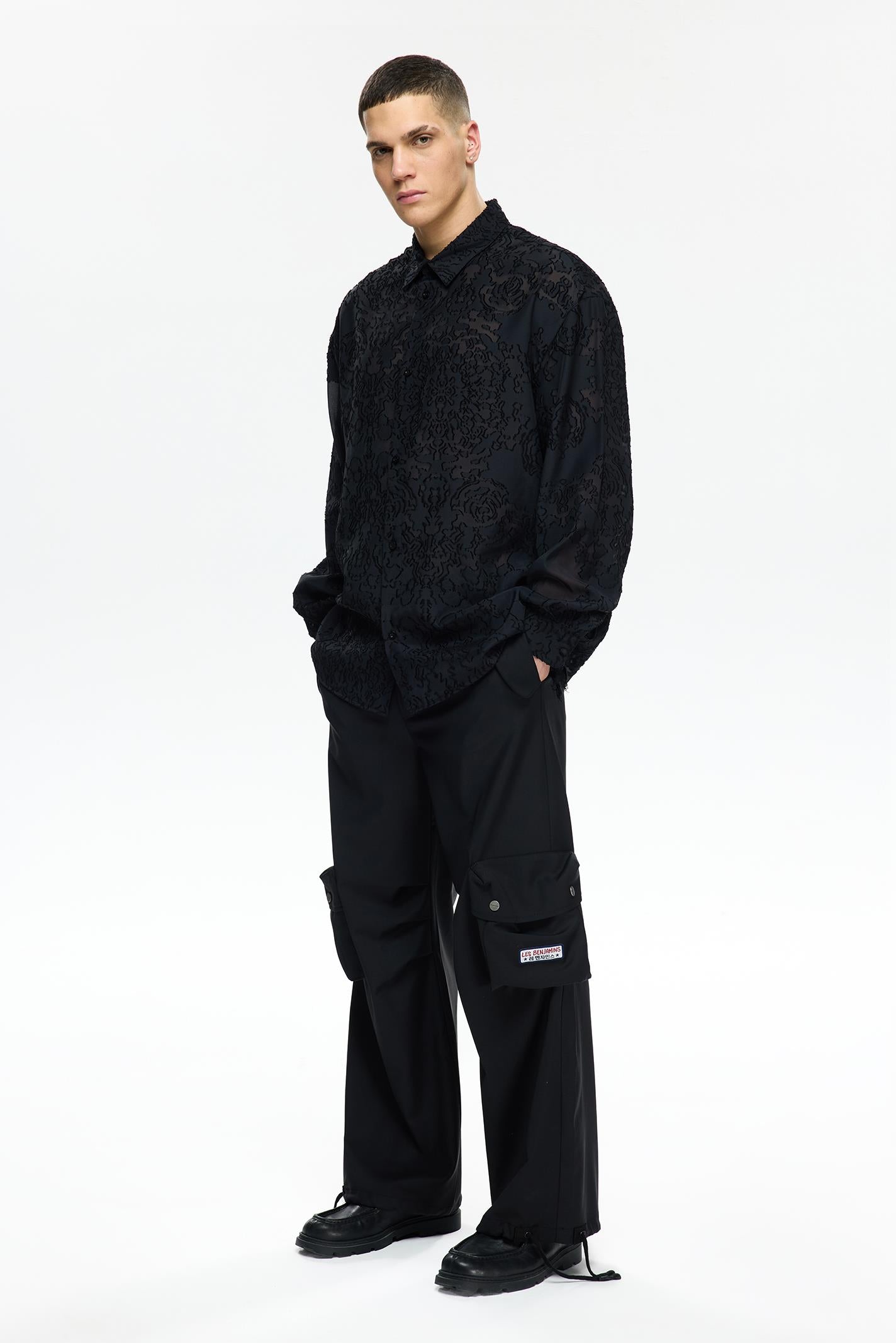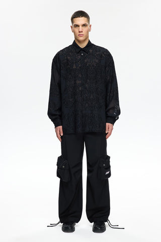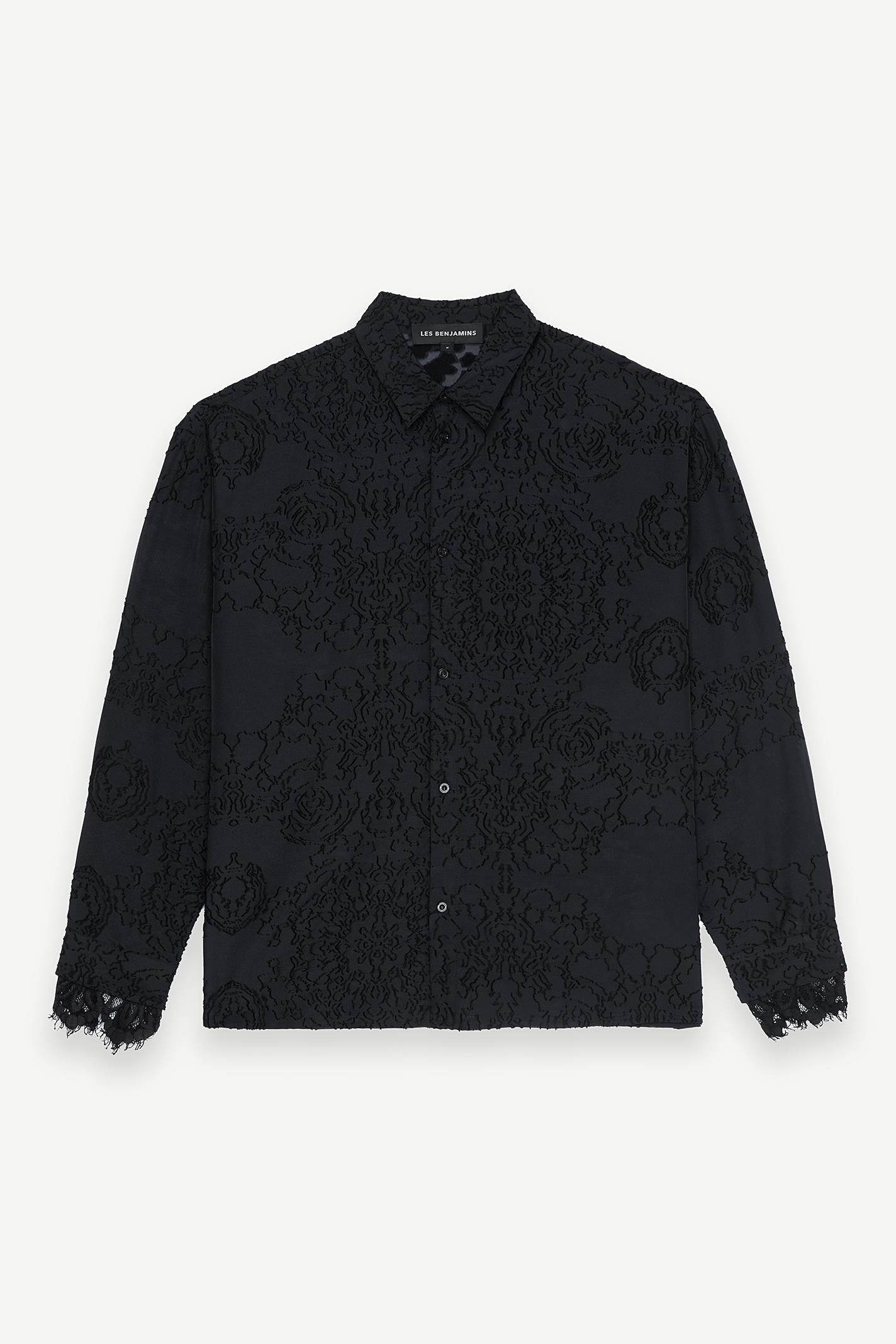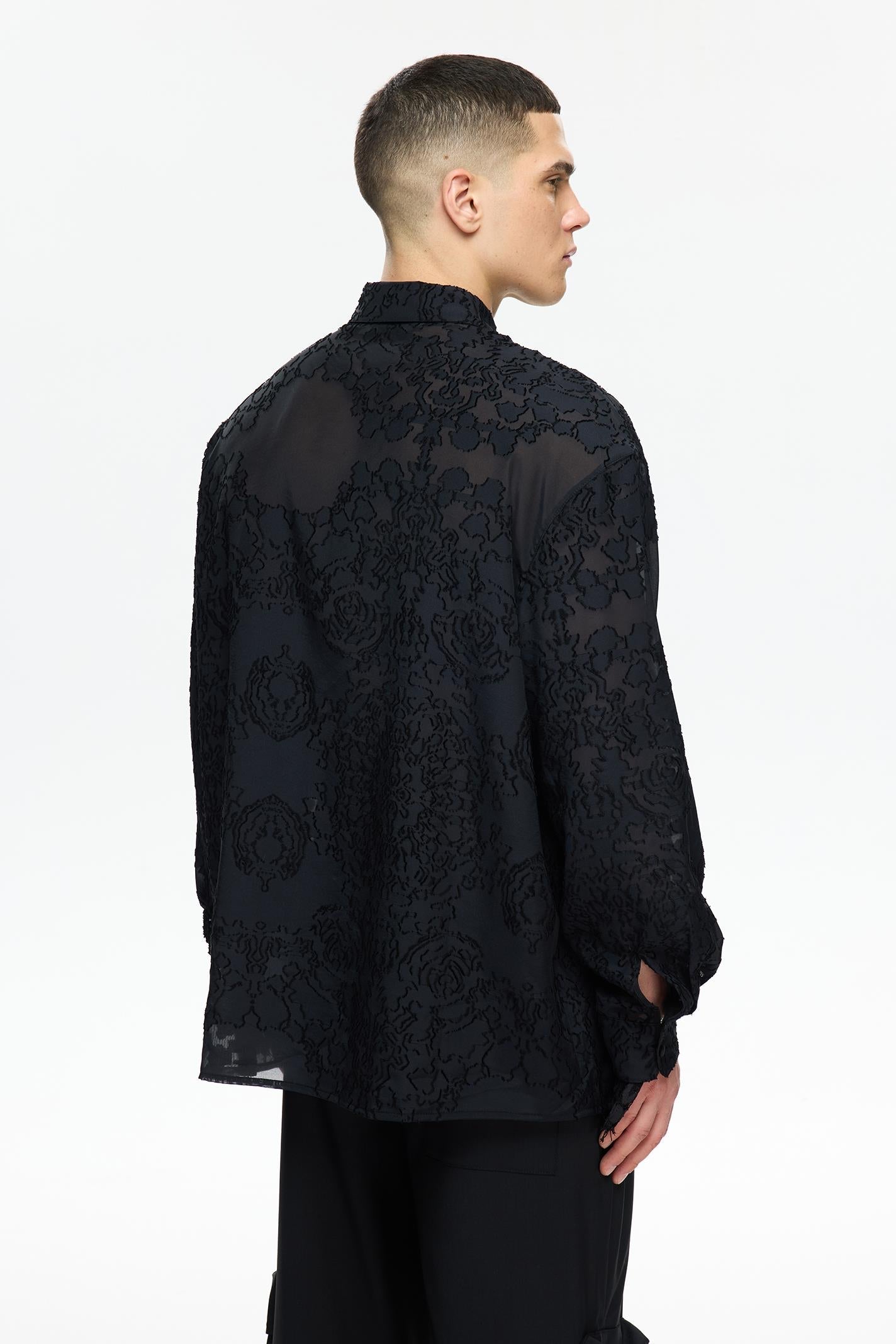 •Long sleeves •Button closure •Devore print •Reusable lace around the sleeve